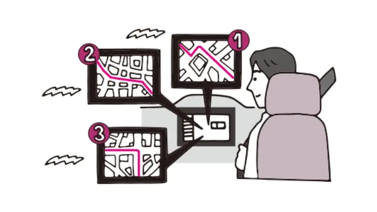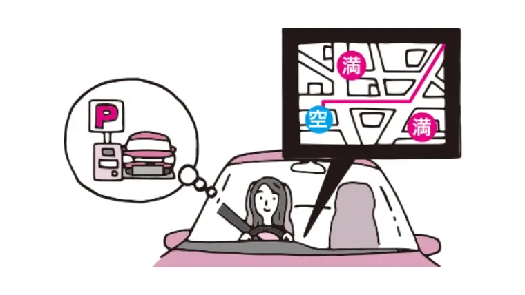 希望に合った駐車場を満車/空車情報とあわせて現在地周辺の地図に表示します。候補から駐車場を選択すると、ルートも案内してくれます。