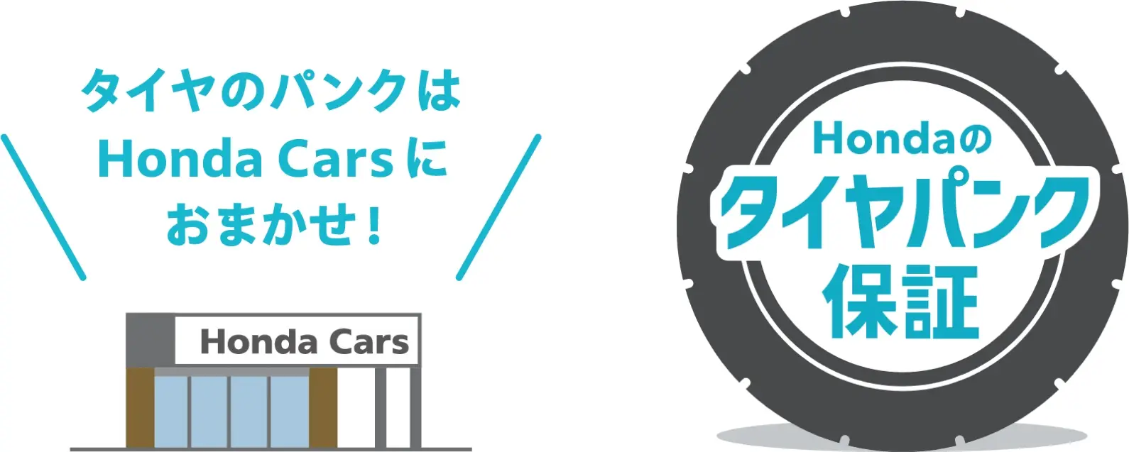 ●Hondaのタイヤパンク保証をご利用いただくには、Honda Total Careへのご加入が必要です。●パンク等が発生した場合は加入対象タイヤと同等以下のタイヤと交換となります。●タイヤパンク・バーストに伴うタイヤ以外の損害やレッカー代等の費用は対象となりません。●タイヤ交換時は1本につき1千円(消費税等相当額を含む)の免責額とタイヤ処分費及びこれにかかる消費税相当額をお客様にご負担いただきます。●加入者の故意によるパンク等が発生した場合は保証対象外となります。●保証期間中1回のみ利用可能です。●本サービスの運営は全国のHonda Cars(取扱店舗のみ)となり、本サービス取扱店舗のみで保証利用が可能です。●詳しくはHondaのタイヤパンク保証ホームページ(https://www.honda.co.jp/afterservice/tire-puncture/)掲載の約款をご覧いただくか、販売会社までお問い合わせください。